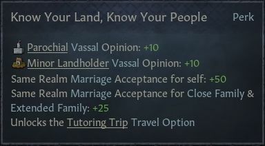 This is inspired by the two educational perks in the game: the Pedagogy perk in the Scholar (Learning) tree and the Groomed To Rule perk in the Family Hierarch (Diplomacy) tree. I wanted a way to enable the player to prepare their heir for the tree if they wanted to dip into it with their next character and give them a solid way to pass on the Traveler trait from one character to another.