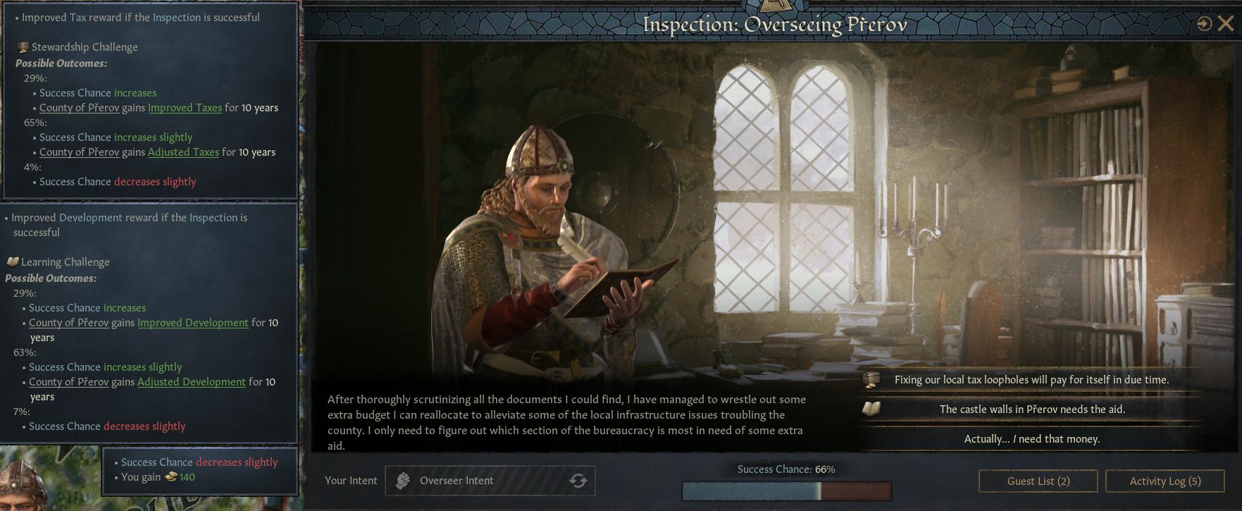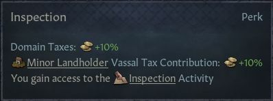 The first capstone perk of the tree opens up the inspection activity. This should open up the fantasy of traveling around your realm more appropriately, as we will see later when discussing the activity. We also attached some tax bonuses,