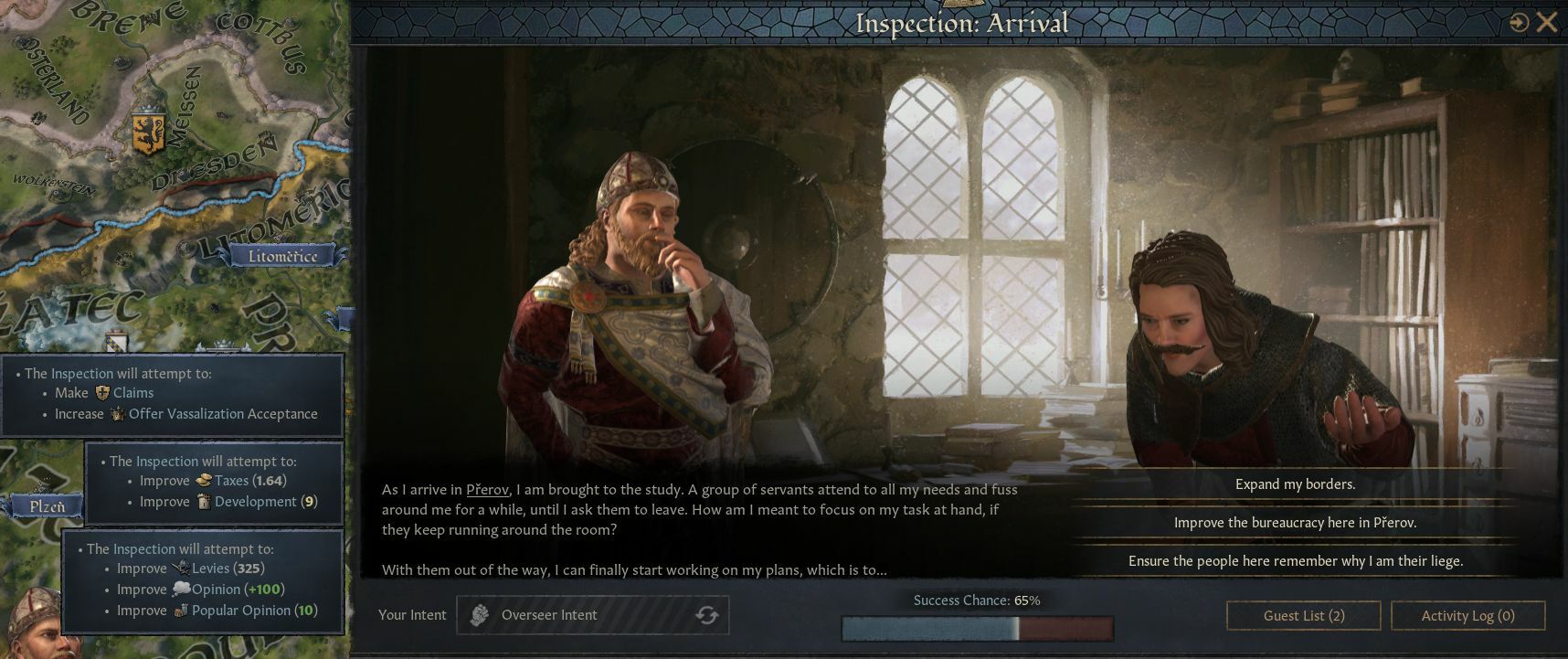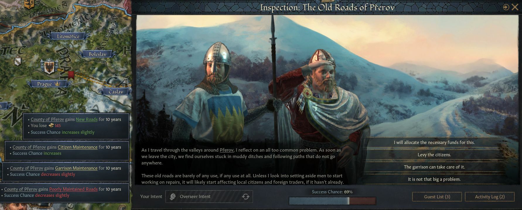 This unlocks a new decision where you can stop a journey to manage the domain for a while. Effectively, you will trade some prestige and travel time to gain legitimacy and either remove corruption in that domain or gain a temporary modifier that will increase levy size, holding taxes, or development. This plays into the same logic as with ‘No Stone Unturned,’ where you can more directly manage one holding and take care of any issue it might have.
