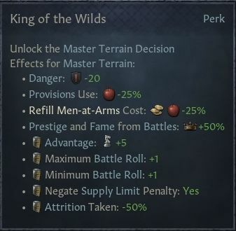 As we looked at changing the “Knowing Your Land” perk, we still wanted to try and keep some of the same fantasy. But rather than knowing your land or its people, you know the terrain you specialize in and how you keep yourself alive as you travel through it. As a significant boon to the Gather Provisions decision, it is an even more helpful tool in getting extra provisions, particularly if you spend most of your time in your Designated Terrain.