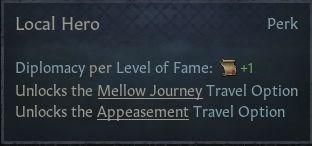 For the Wayfarer tree specifically, we made the perk of both lines leading up to the trait a bit of a capstone perk. In this case, the Local Hero one is intended to be a great boon for those grabbing all that fame, giving them a decent Diplomacy boost. It also gives you access to two new travel options, one of which provides you with another way to play into fame and stress loss: