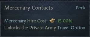 So, with that in mind, what were the themes for the Wayfarer tree? We attached it to Fame (Prestige Experience) and Stress Loss. Attaching it to fame, rather than Prestige, enables us to give out some more sources without worrying about giving out an abundance of Prestige to the player. We also wanted to include a bit of a “friendly ruler traveling through their domain” kind of feel to it, so we have some perks trying to enable that fantasy.