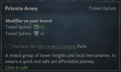 We wanted to give the Voyager an easy, cheap option to provide general boosts to their travels, but taking a travel option spot. This means you can travel far with fewer dangers, presumably, but you are giving up other opportunities. Due to the name, we attached a bonus to hiring regular mercenaries.