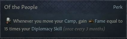 This is the first perk dipping into the fame synergy we wanted for the tree. By letting you travel around more safely (from the first perk) and now giving you a fame gain, you can start racking up fame while participating in activities or traveling to distant lands.
