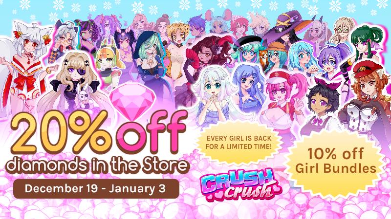 From December 19th all the way to January 3rd, save 20% on all Diamond Bundles and 10% on all DLC Girl Bundles. We’re also making those Diamonds go farther with 10% off all store girls! And when we say “all”, we mean ALL, because for the duration of this sale, every last one of them - from Amelia to Wendy - will be available in the Store! (Note to self: come out with a waifu whose name starts with Z so that alphabet joke works better…)