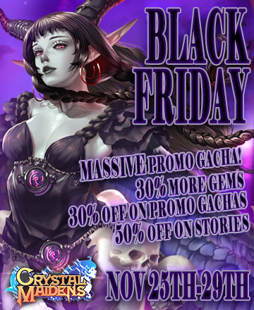 The Black Friday sale has now begun! Starting now and until November 29th, get: - 30% bonus gems on all gem purchases! - 50% off on special animated scenes! - 30% off on certain promo gachas! - A unique Black Friday promo gacha!