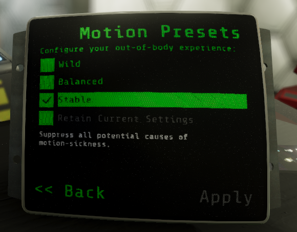 However, feedback from some players suggests the physics / camera motion can be a little taxing on the stomach... so for those players it is suggested to try the Balanced preset first, and then if that is still too lively, try the Stable option.