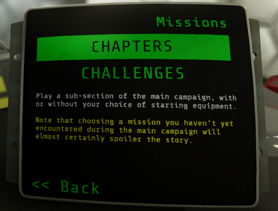MISSIONS **NEW**: All sections from the main campaign can now be played as separate standalone missions. They can even be played before reaching them as part of the campaign (though this will spoiler the campaign, obviously).