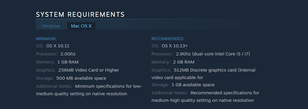 The game runs well on several Mac books and iMacs tested, including older 2014/2015 varieties. On Macs with dedicated video cards and newer CPUs you'll have noticeably faster and smoother gameplay.