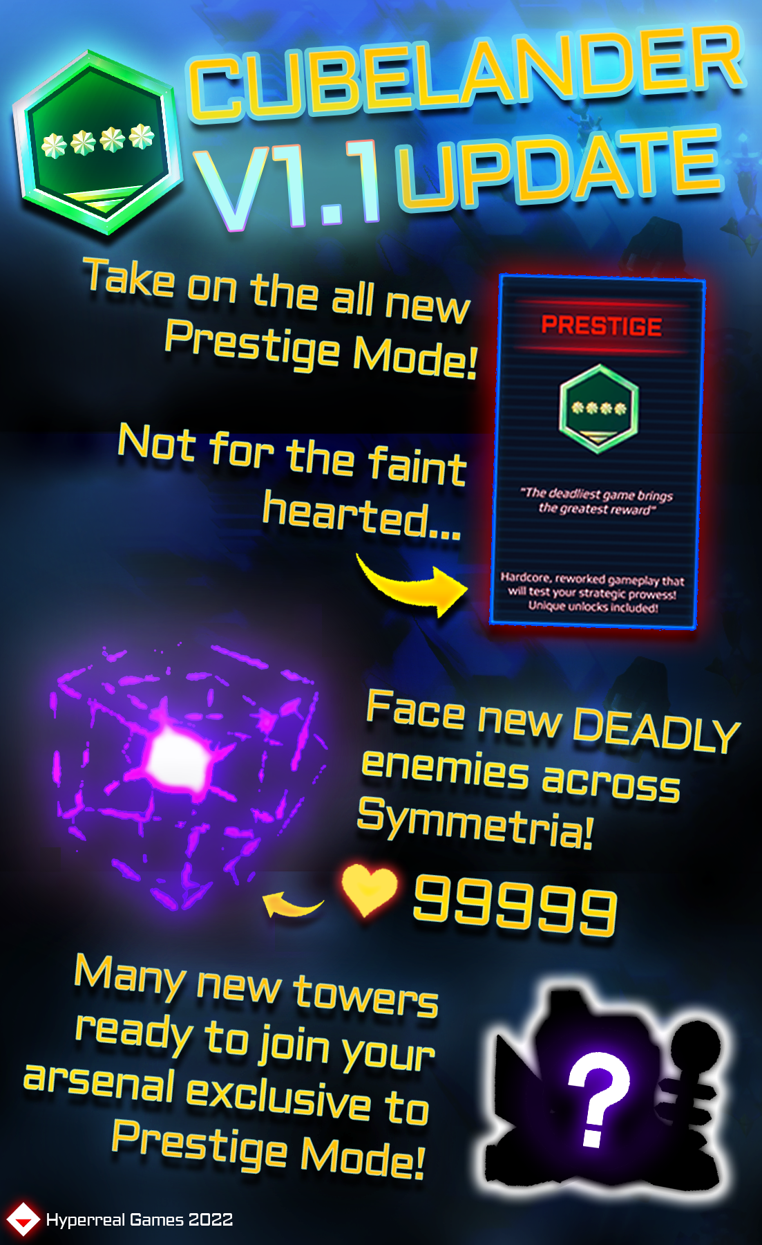 Prestige Mode Unlocks - We're formally introducing you to two new towers, that have exited the beta testing stage in V1.0: the Cube Corp and Hydra Cannon, which are versatile additions to your arsenal!