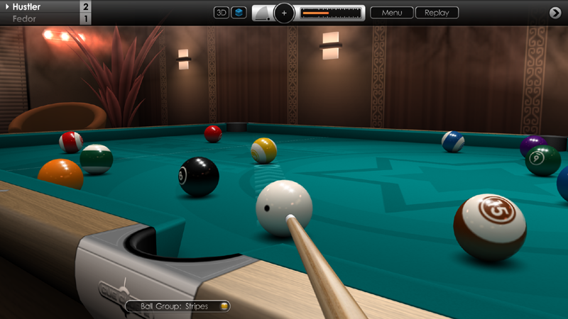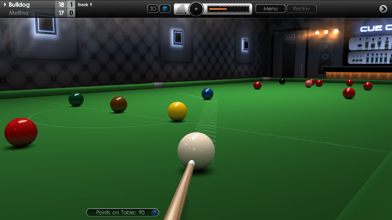 Increased the range of settings for the camera in first person mode, allowing the view to be moved even further back along the cue. See 'Options > Cameras > Distance to Ball (3D)'. Ranges from 30cm to 1.5m over 10 settings. Note: increasing the distance over 1 metre will raise the height of the table lamp to reduce potential obstructions when the camera is positioned up high.