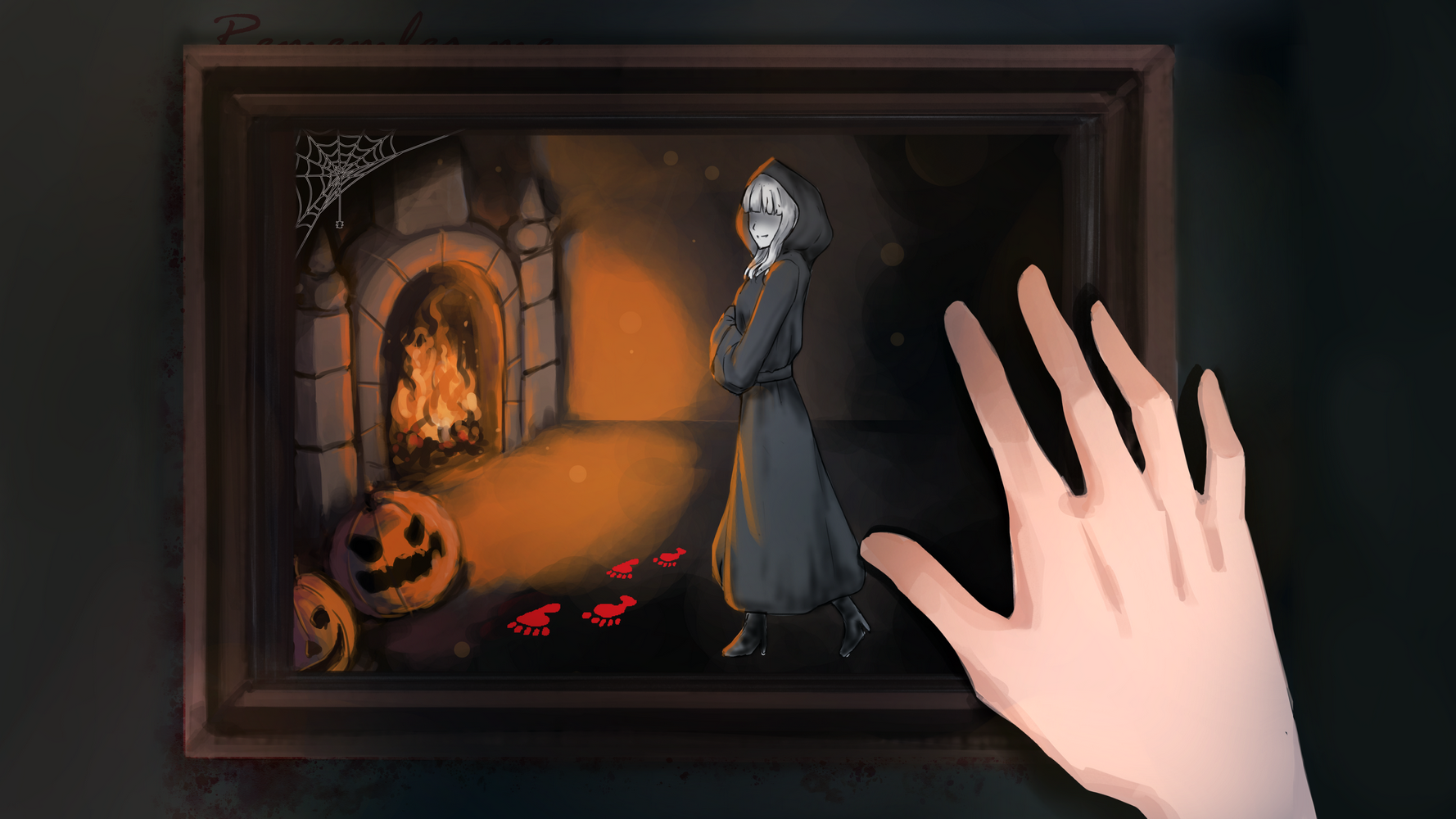 You found something, it's a picture of someone in front of a fireplace with pumpkins and cobwebs. With the long hair, they look like a girl. There are also red footprints but doesn't seem like she is the one who made it. You start to feel uneasy. You just realized there are traces of blood around the picture. It looks like there's something written behind the frame, but it seems like you can't move this framed picture. ---