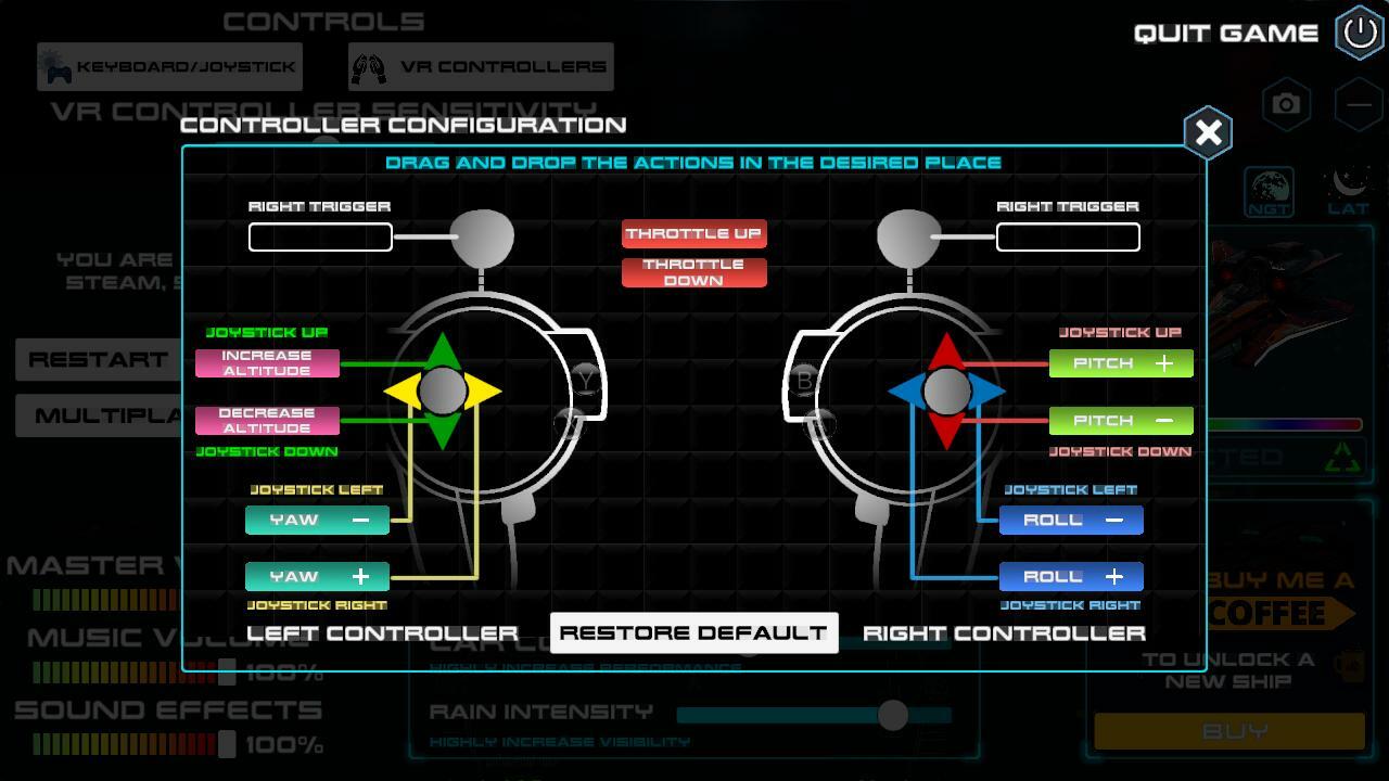 We fly the ship using inputs that are optimized for the experience we thought was ideal. But we are a small group of people and we really think you will have the best options for controllers! So, configure it as you like!