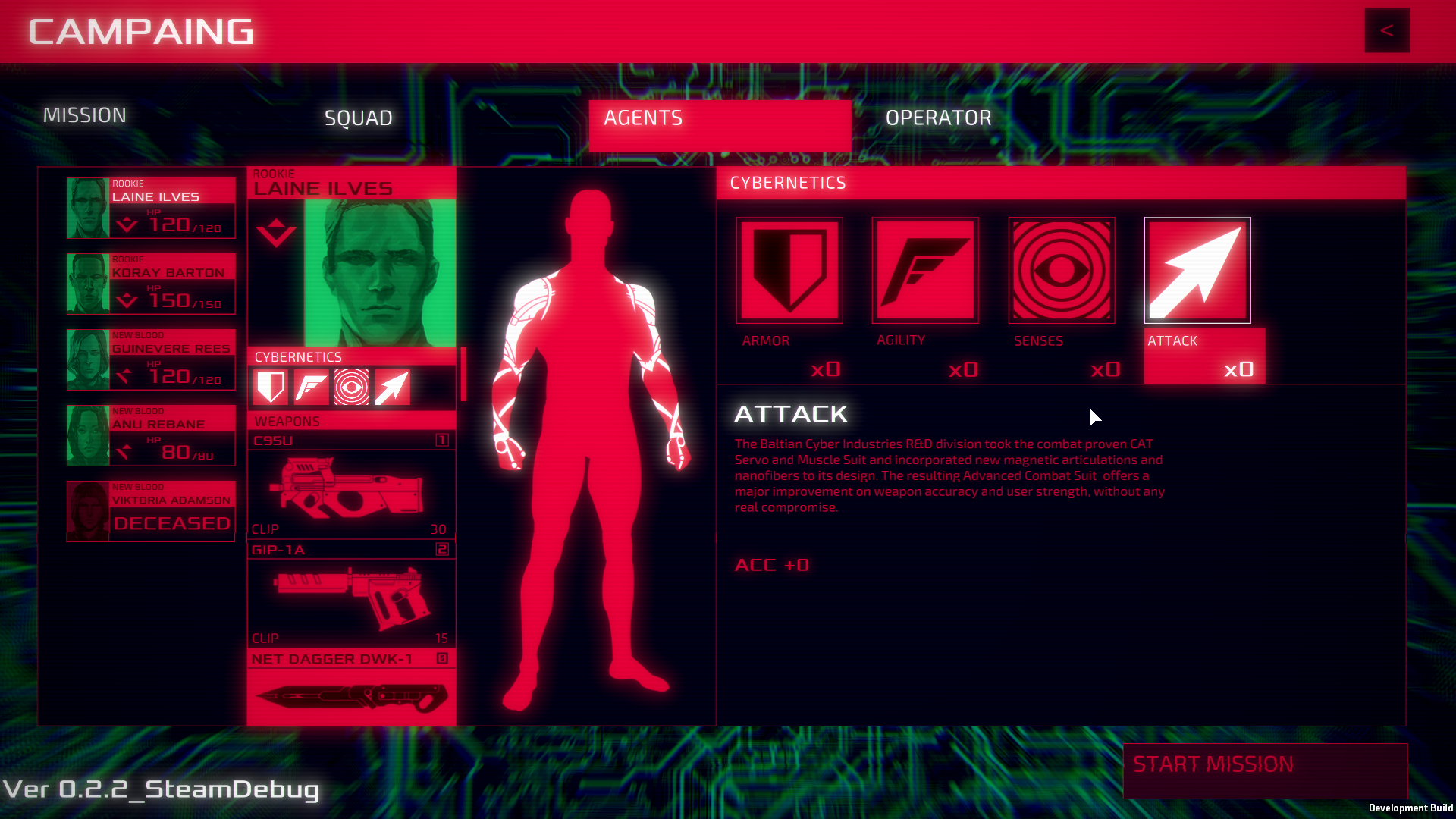 For more aggressive Agents, a stronger body is more suitable for CQC and melee fights. The Baltian government issued a request to the Baltian Cyber Industries R&D division to improve the combat proven CAT Servo and Muscle Suit, for special operations usage. The incorporation of new magnetic articulations and nanofibers to the CAT suit resulted in the improved Advanced Combat Suit, offering an increase in weapon accuracy and user strength, without any real compromise.