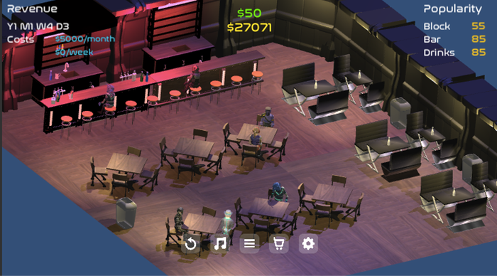 We’ve finished implementing the new bar environment into gameplay, which is unlocked via upgrading the bar and unlocking the second floor. It will open up many more customization and dialogue opportunities, in addition to allowing you to serve more customers.