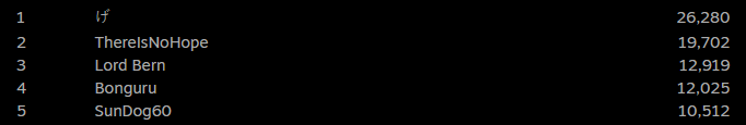 Congrats to ThereIsNoHope for topping yet another monthly with an impressive 21k score. We'll have to start tracking how many monthlies people top, and have another leaderboard for that... Yay, more leaderboards!