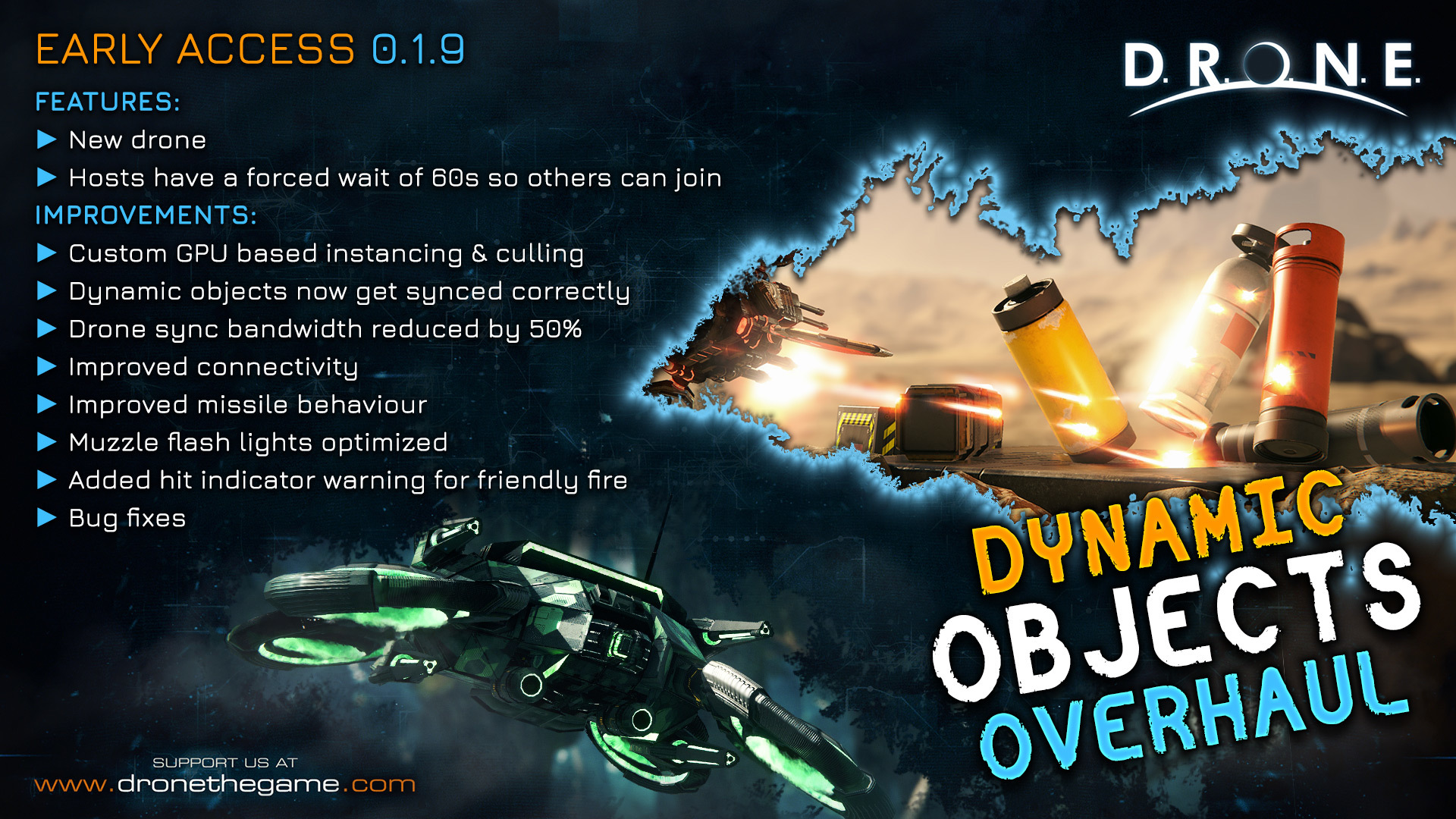 Besides a new drone, connectivity has been improved and all dynamic objects sync almost perfectly now. Missiles are a lot better too.