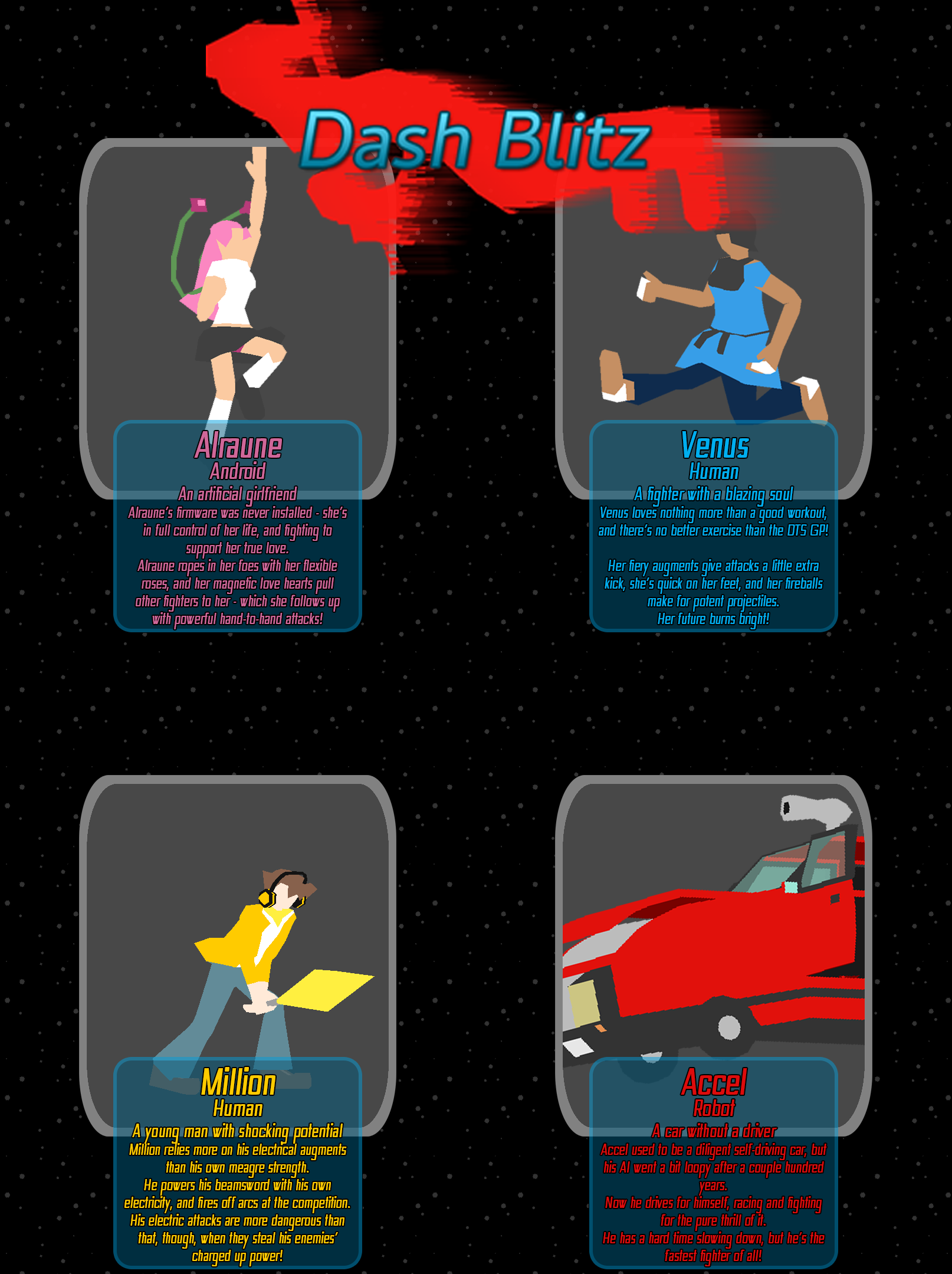 Dash Blitz has a brand new menu system! This much more conventional system allows you to quickly and easily select your fighters and vote on stages.