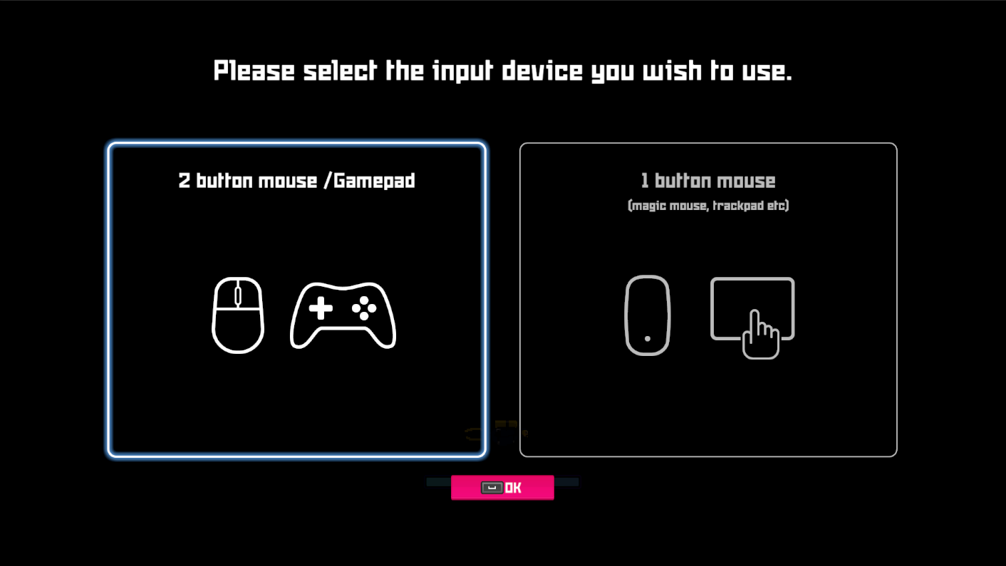 1) Control functionality added for 1-button mice - Added the option to select your input device to play the game using a Magic Mouse or trackpad. Please note that if it is your first time starting the game, you will be given the option to select your input device. If you have already started playing with a different mouse and would like to use a Magic Mouse or trackpad, you can change your input device by going into your Settings -> Mouse Input Device on the screen shown below.