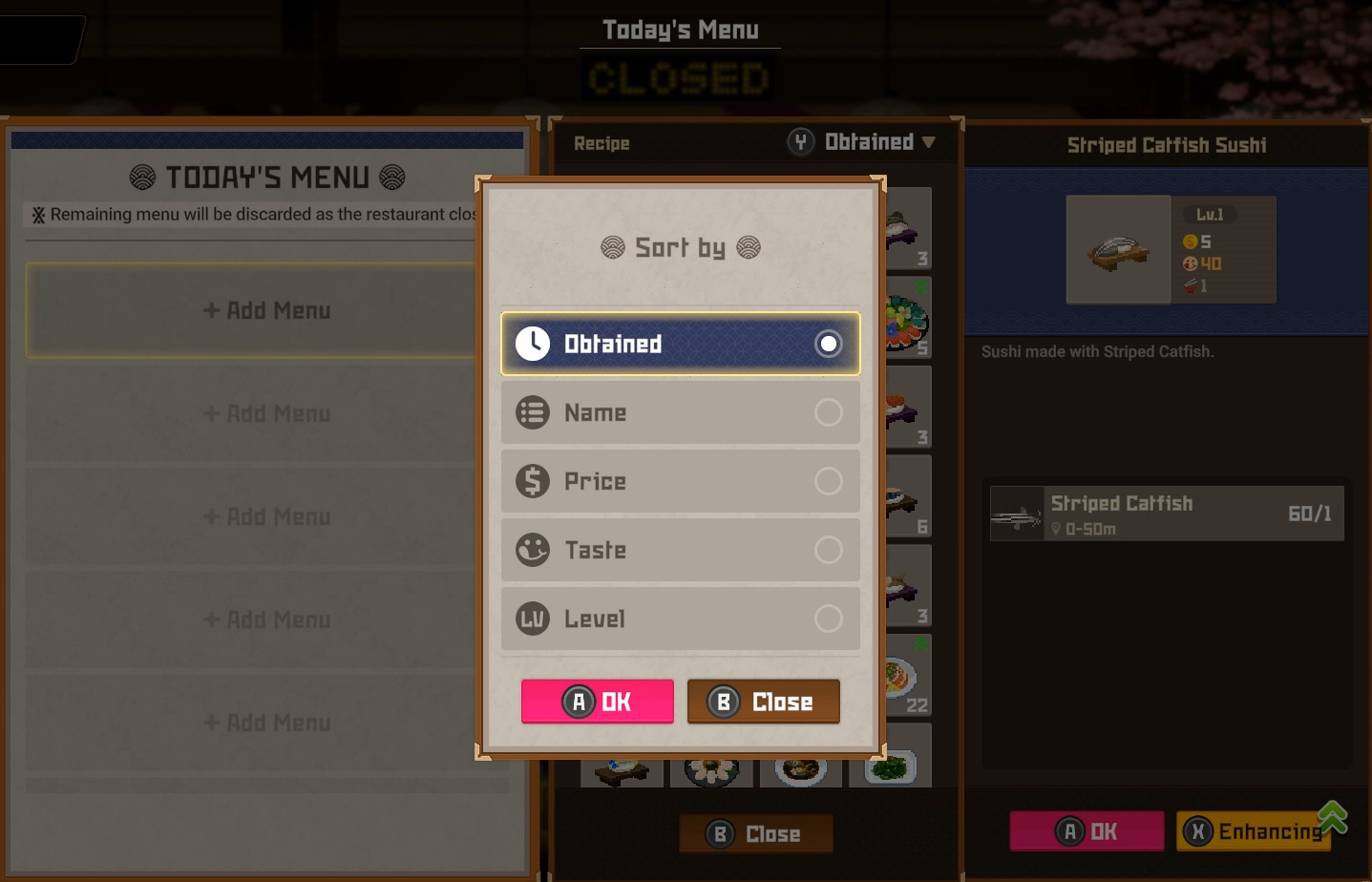 1) Recipe sorting function - Recipes can be sorted in the menu screen with the following filters 2) Multiple Save Slots - Additional save function apart from the default autosave * Manually saved files can be loaded at the main menu screen 3) Fish active time icon (Day/Night) - Fish active time icon in Marinca and ingredient menu added 4) Winter holidays interior items in sushi restaurant - 7 seasonal interior items added