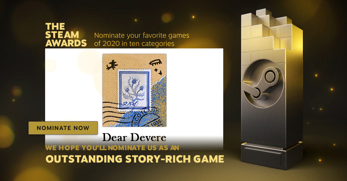 A big thank you to everyone who has nominated Dear Devere for the upcoming Steam Awards! This is a lovely surprise!