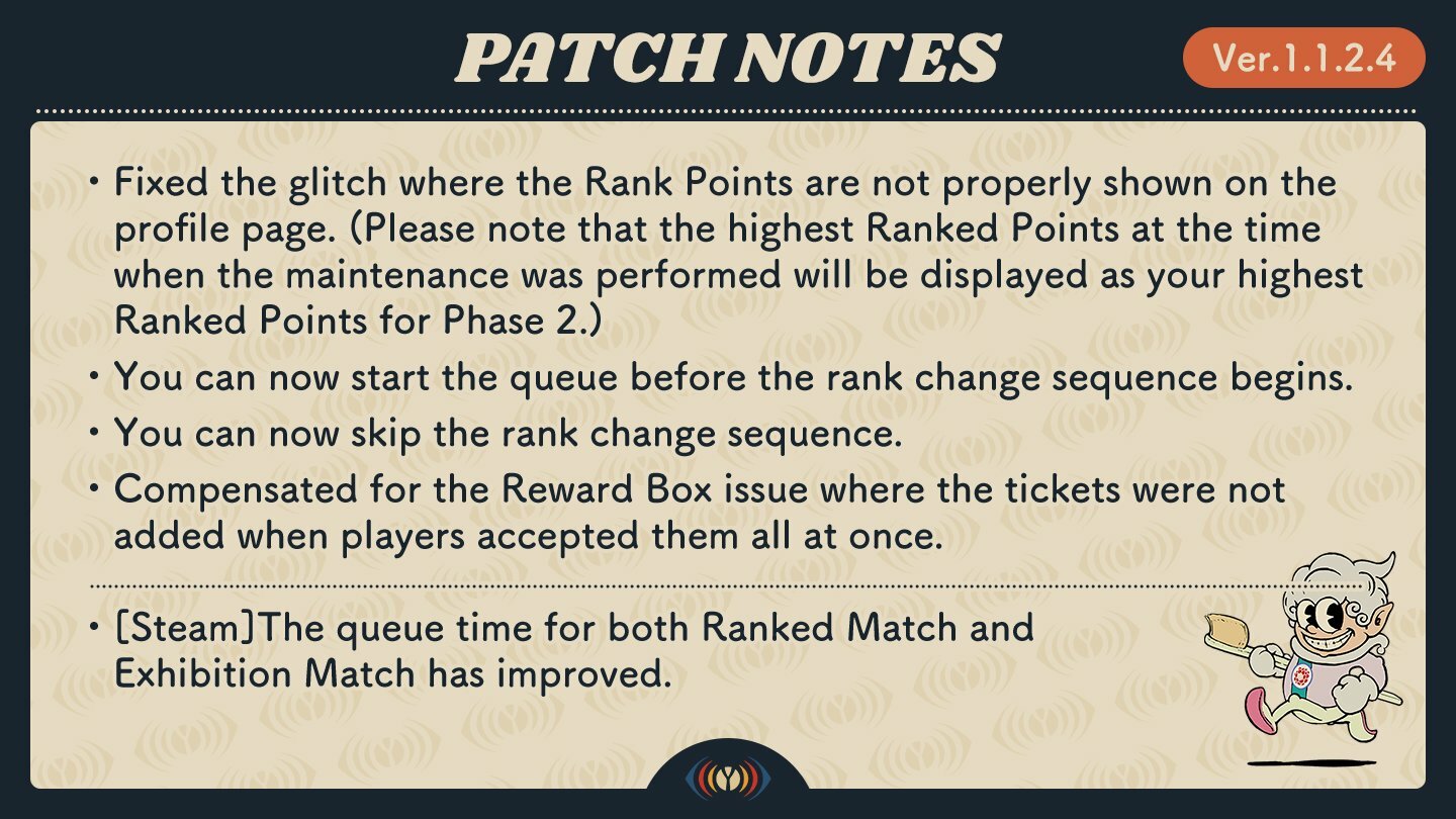 - Fixed a glitch where Ranked Points are not properly shown on the profile page. (Please note that highest Ranked Points earned at the time when maintenance was performed will be displayed as your highest Ranked Points for Phase 2.) - You can now start the queue before the rank change sequence begins. - You can now skip the rank change sequence. - Compensated players for the Reward Box issue where new tickets were not added to a player's inventory when rewards were accepted all at once.