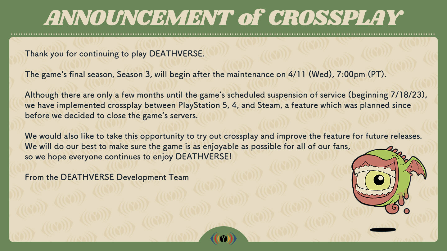 Thank you for continuing to play DEATHVERSE. The game's final season, Season 3, will begin after the maintenance on 4/11 (Wed), 7:00pm (PT).