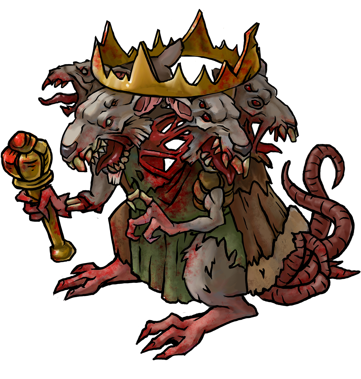 The Rat King is a collection of rats powered by the dominating goal of survival tied together by their tails. The Ash Curse bound them in a macabre joke from an elaborate myth. Rats normally thrive in sewers feeding on debris and refuse from humans, but as they started collecting together, they consumed more. The Rat King departed the sewers in search of more food, not making it too far as the writing mass attempts to go in multiple directions at once, only focusing on one goal when food is present.
