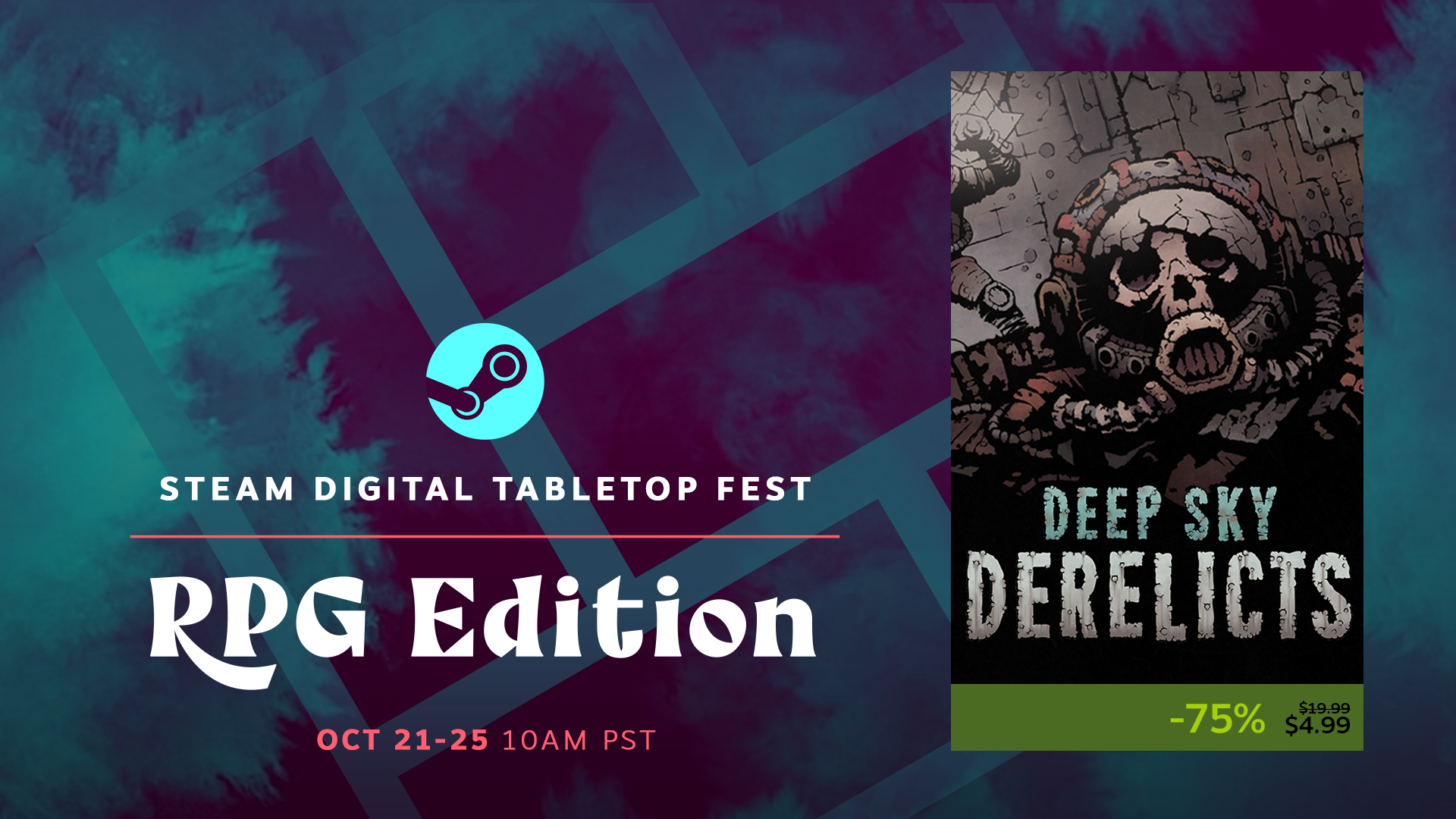 Today the Steam Tabletop Fest begins and Deep Sky Derelicts will be a part of it! From today, until October 25th, you can grab Deep Sky Derelicts and both of its DLCs with a 75% discount! And that's not all - executive producer of Deep Sky Derelicts and CEO at Snowhound Games, Dmytro Zhovtobryukh, will be part of the Sci-Fi RPG Settings & Environments Panel Discussion that will be held this Sunday, October 24 at 12:00 AM so mark that date in your datapads!