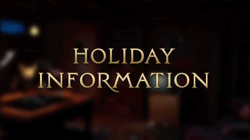 The holidays are upon us and this means that we will be taking some well-deserved time off with our loved ones. During this time we will only handle game-breaking issues.
