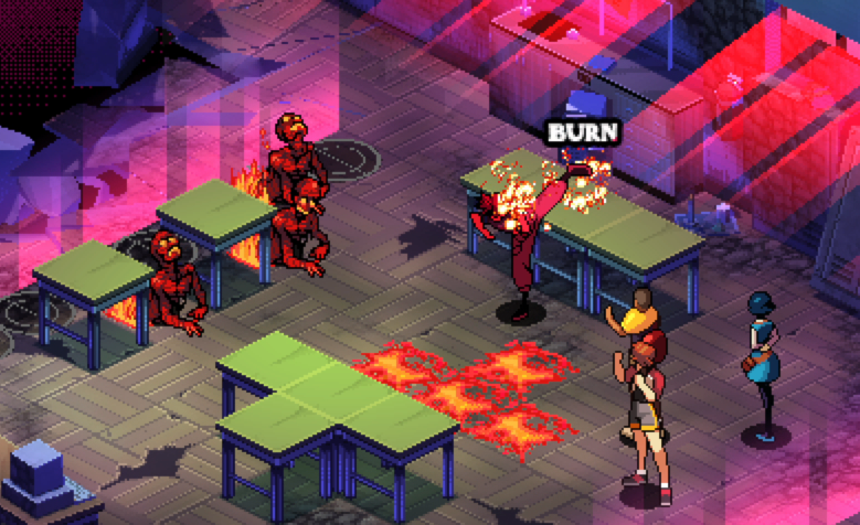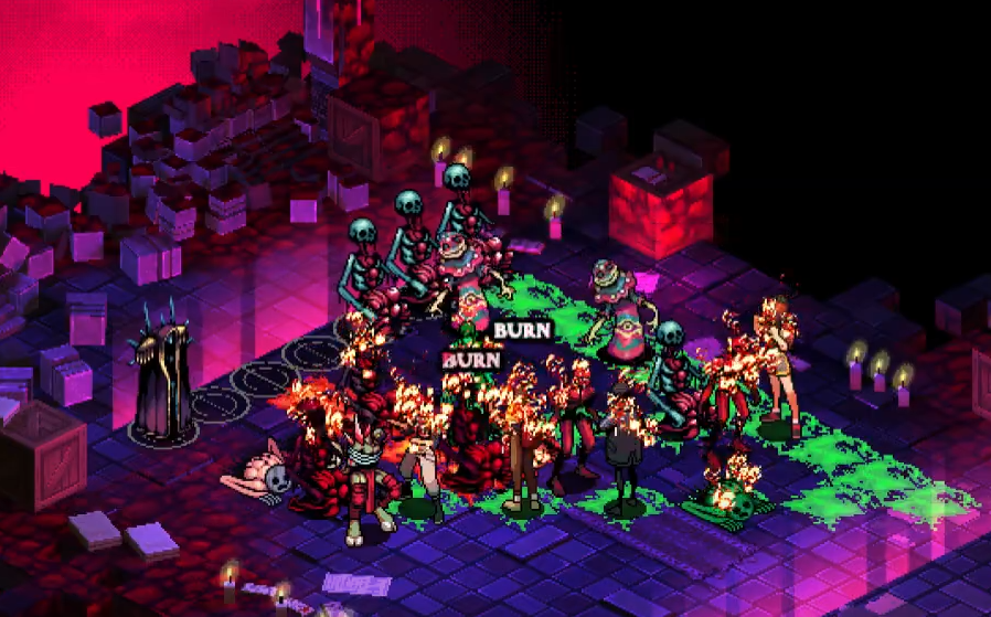 We tried it, and it was ridiculously fun. Now, if your character is on fire and they hit an enemy, the enemy will also be set on fire. If you hit an object, that goes on fire too. If your burning character stands next to an enemy or even a friend, they will go on fire next turn. You can set the whole playing field aflame. The problem is, of course, you're slowly losing health as you go around setting everything ablaze. You want your characters to lose health at a slower rate than everyone else. So the thing to do is heal your character. They'll lose their burn status in the process, but you can always retrieve it again from the flaming surroundings. So a brawler/healer combo, running around the world setting things on fire and healing each other, can act like a (twisted) firestarter team.