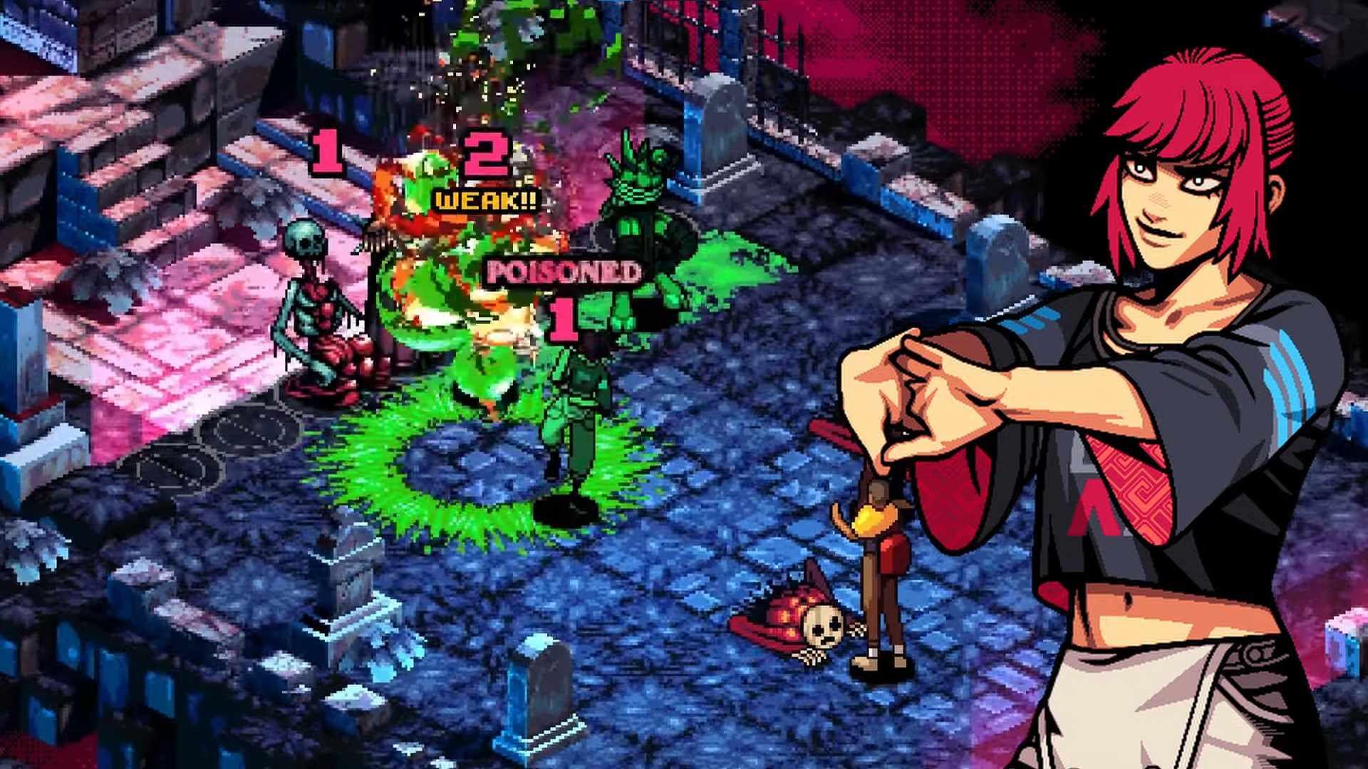 Like many tactics games, Demonschool has a number of status effects. Some of them are old standards. There's Poison, which reduces a character's HP by 1 per turn, or Stun, which keeps a character frozen in place until they are healed. Others are tweaks on effects we've seen elsewhere. Doomed, for example, kills the inflicted character within three turns unless they're healed, regardless of how much HP they have. Tethered is a Stun-like status that's only inflicted as long as a character is grabbed by an enemy. We also have the Possessed status, in which a demon rides your characters like a jockey, trying to move them into places where they'll take damage.