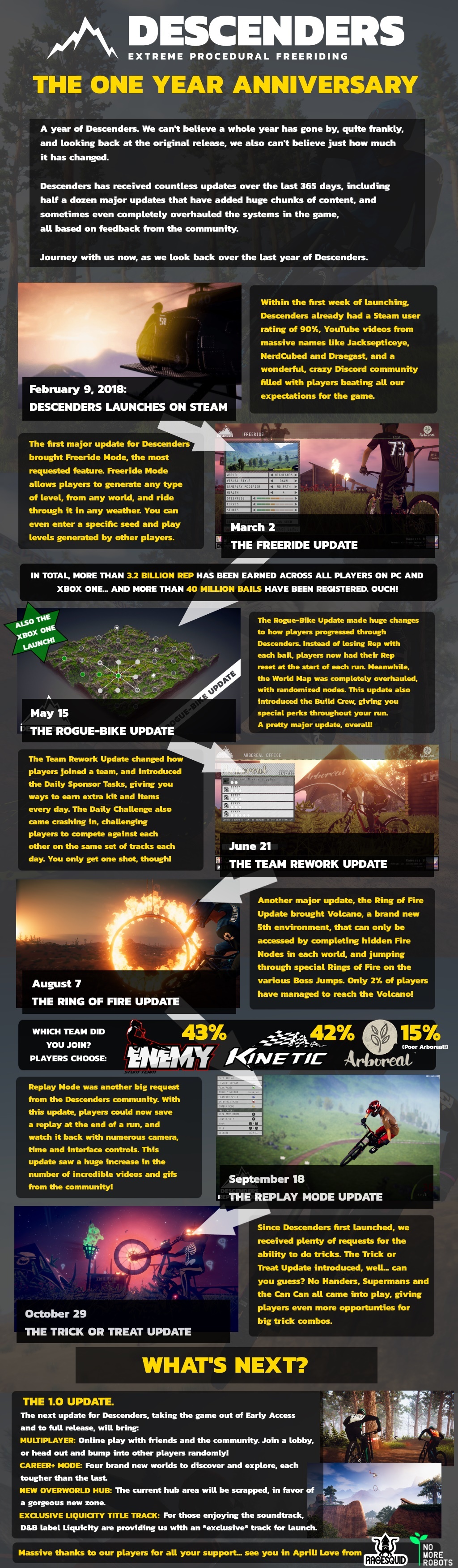 Can you believe it's been one whole year since Descenders launched on Steam? What a ride it has been... and as we come to the end of that ride, with the upcoming 1.0 Multiplayer launch, we wanted to look back over the last year with you.
