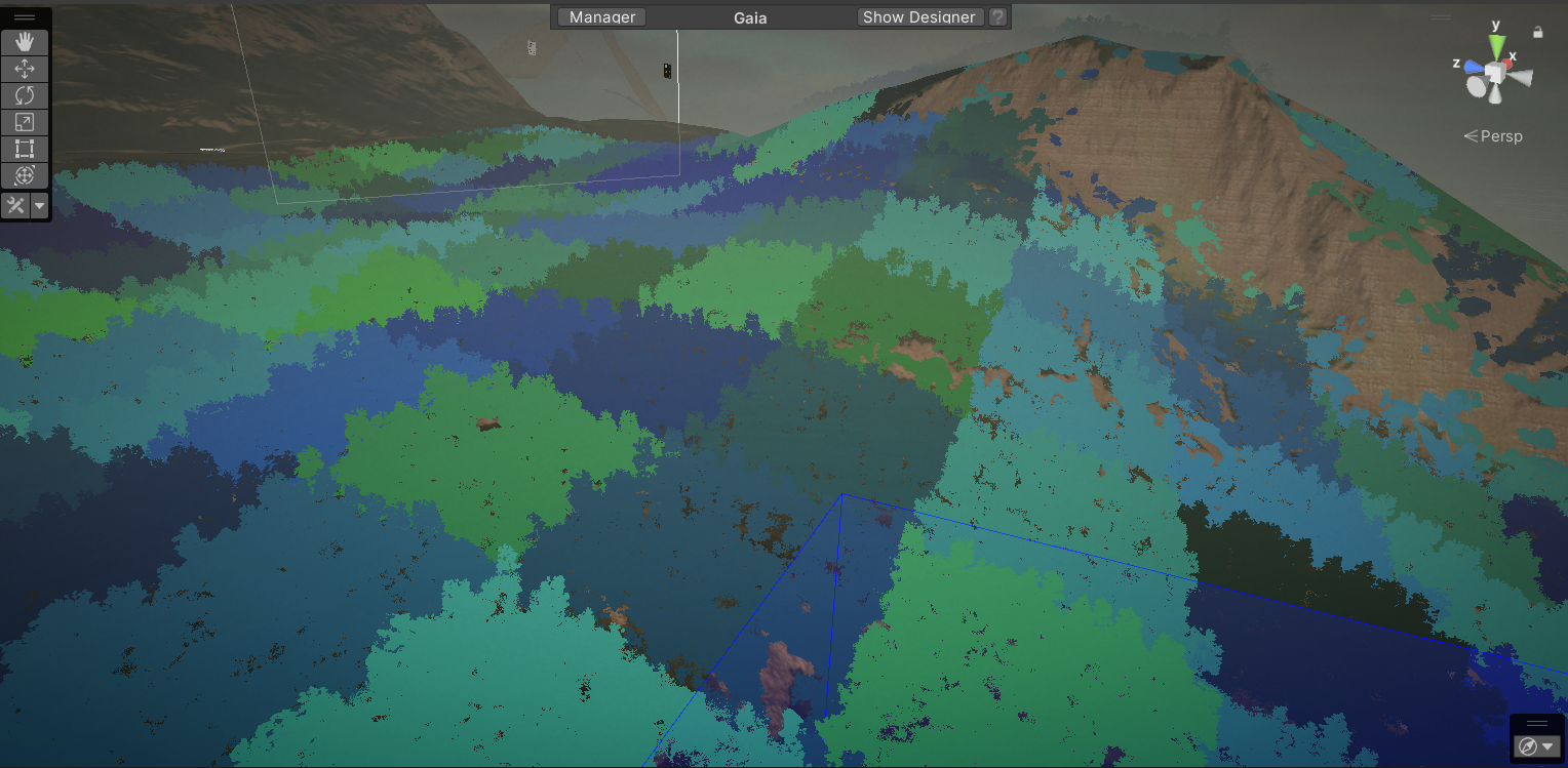 Once all the occlusion culling is baked, the terrain now obscures vegetation cells. Green lines indicate visible cells, and lack of lines show that the small hill is occluding quite a lot of cells.