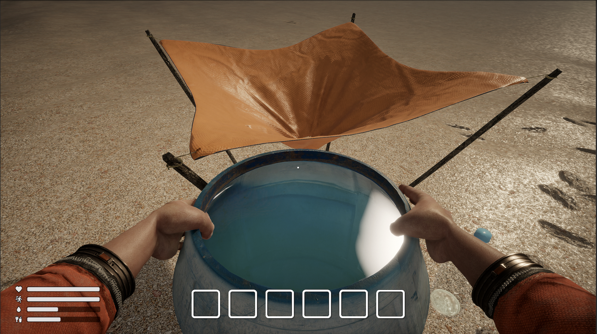 A solar still distills water using sunlight, desalinating and purifying it in the process. This is an actual real-world survival gear and commonly equipped on life rafts. The process is slow, often taking an entire day just for a bottle of water.