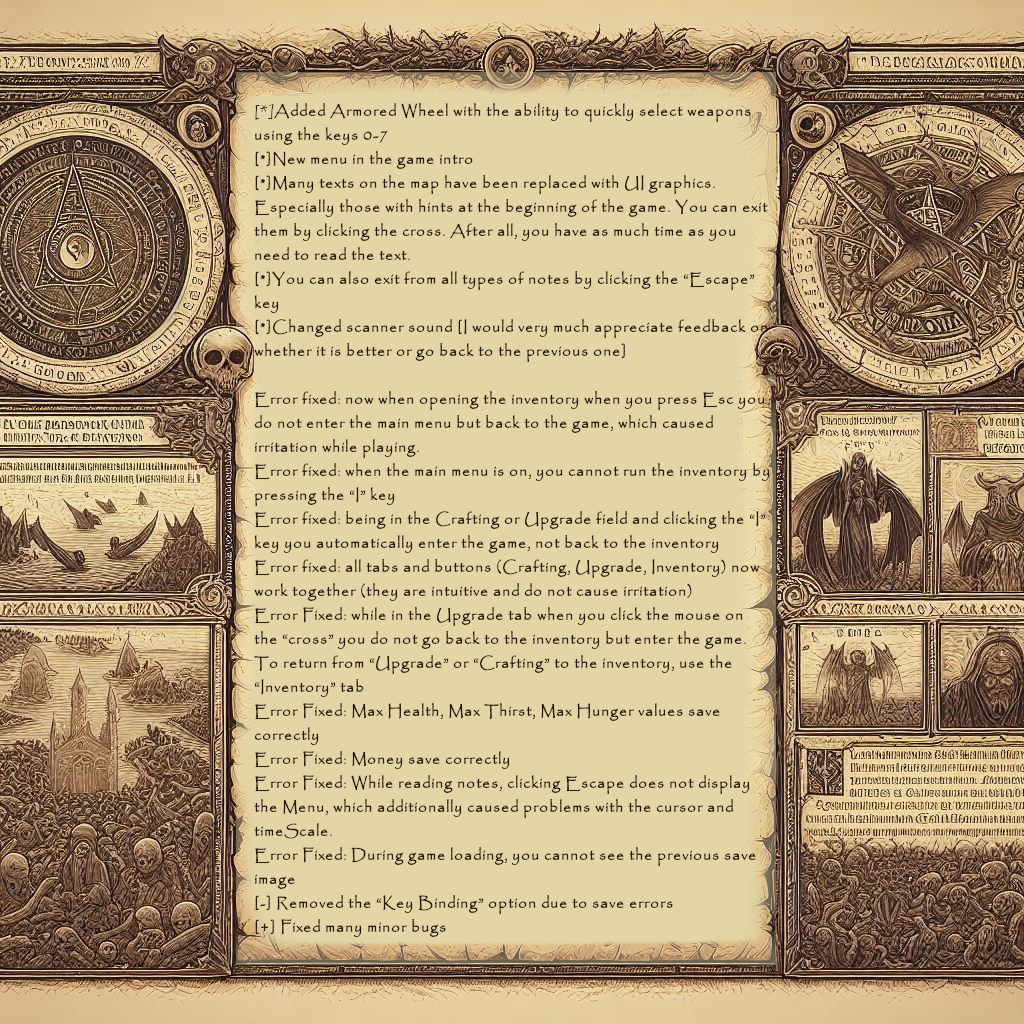 1. The main and most important update is three new language versions! -German -Japanese -Polish 2. New refreshed and fixed UI, new fonts that are better for the eye, new menus and errors with the UI when changing resolution. 3.New skill-“Bonus Damage”. From now on you can increase the damage inflicted for your DNA points. 4.New item- From now on you can produce your own batteries for the scanner from what you find in the forest