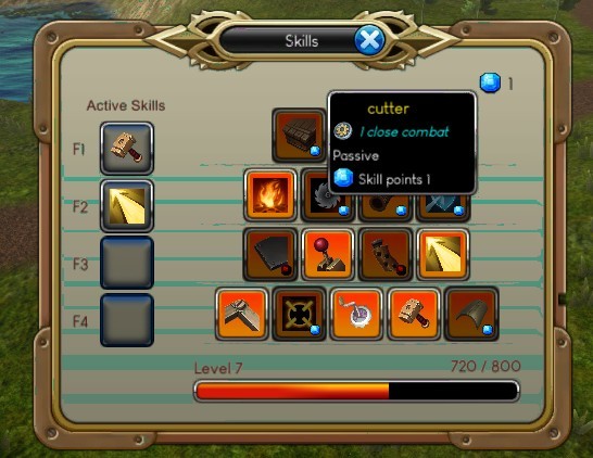 In addition to passive skills that increase statistics, you can also choose 4 active skills, activated with keys, with cooldown.
