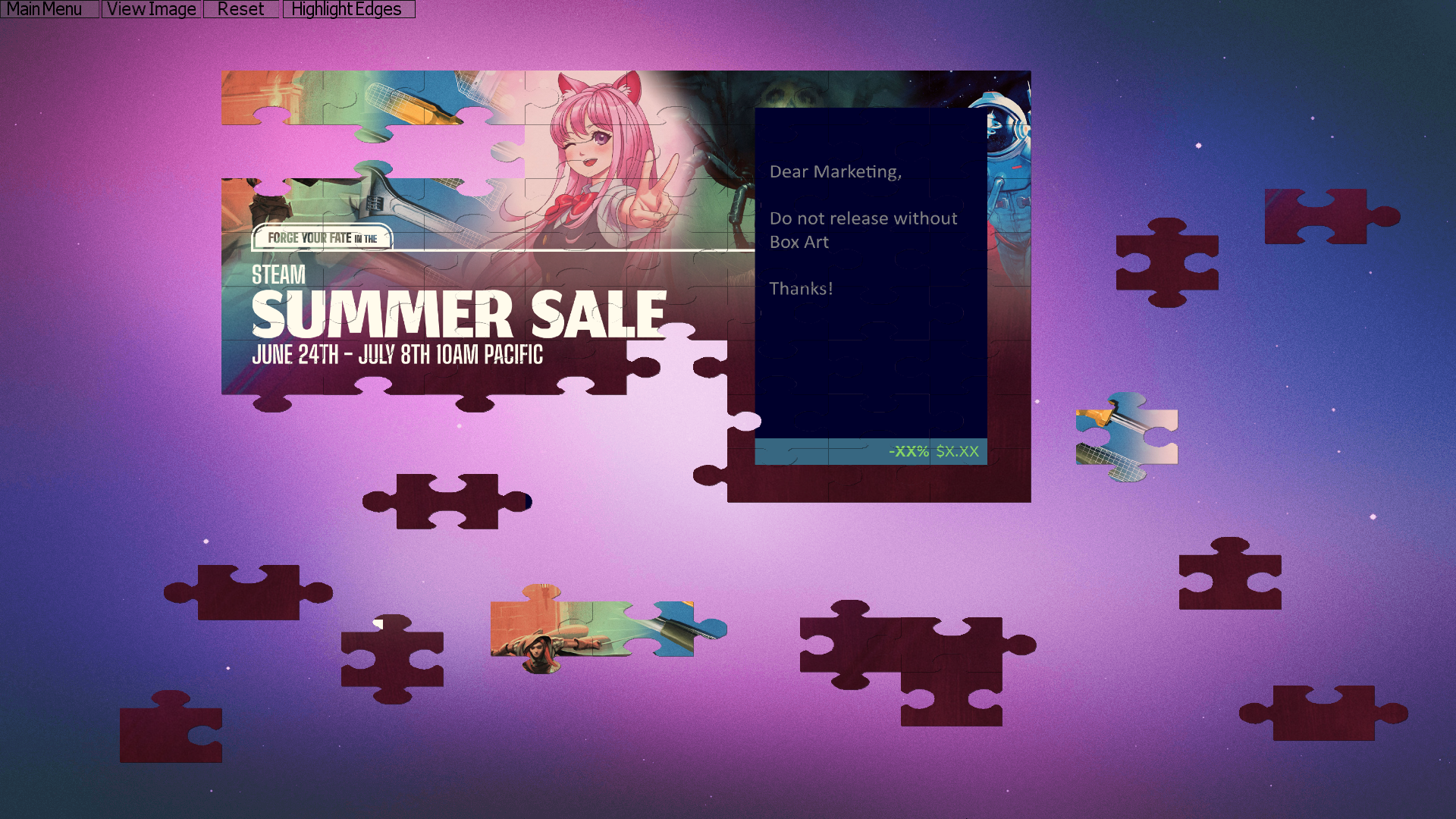 Steam Summer Sale is here. Write me an ad. Can you add a paragraph on how the ad was loaded as a custom puzzle into our game? Use it as a way to advertise that any photo can be loaded as a puzzle. Find a clever way to make fun of the other Jigsaw puzzle games charging for DLC in the process.