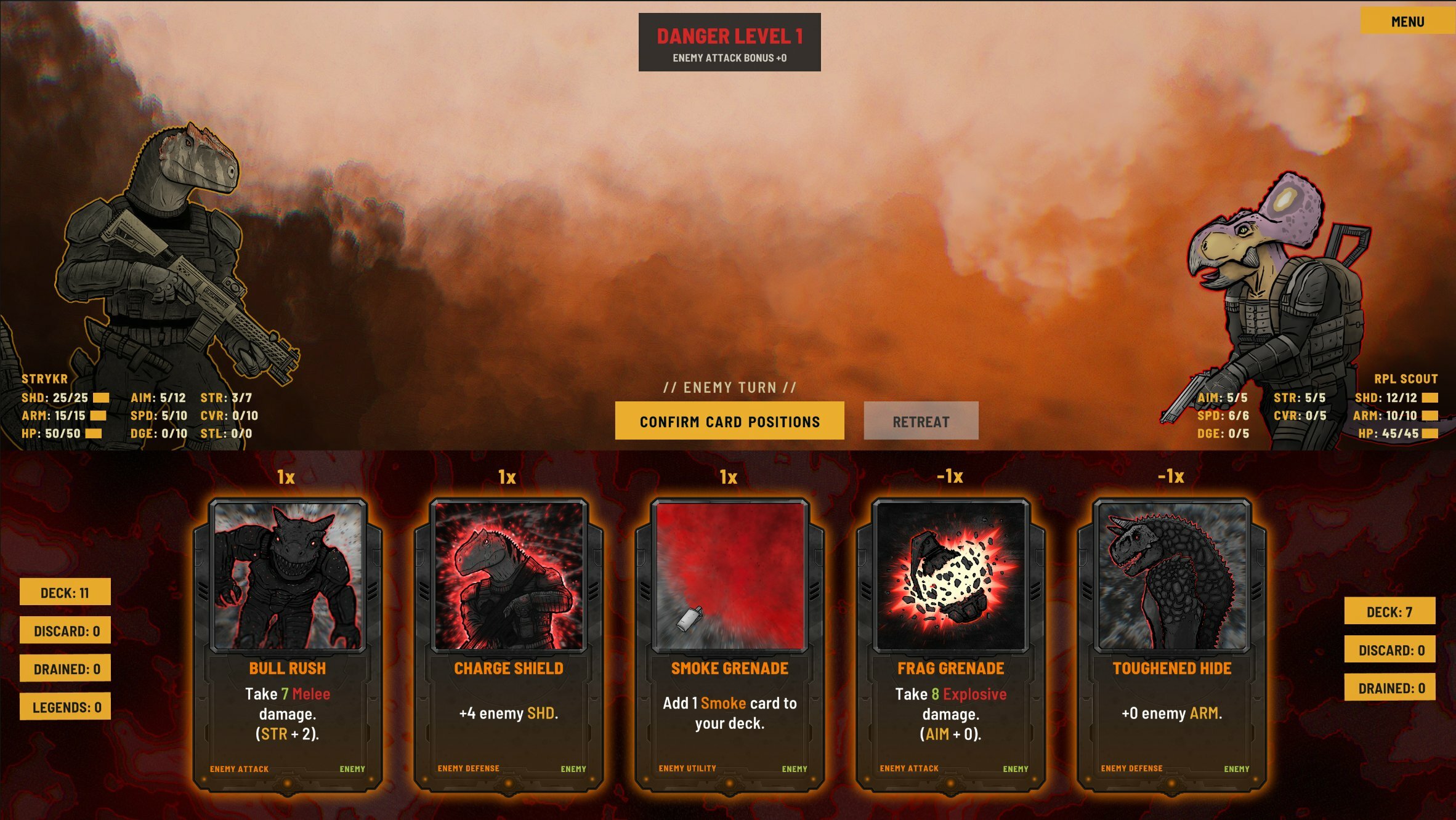 - There were some issues with how stat bars for the player and enemy were being initialized and/or updated at the beginning of combat encounters, leading to occasional situations where cards wouldn't be drawn. A few players reported this issue to me, and after this fix, I haven't experienced it again. But, please let me know if it reappears! - Ensure that enemy cards aren't added to the player deck in instances where you might retreat during the enemy turn or the enemy dies during their turn (e.g. bleeding damage). - Some minor UI polish for stat bars