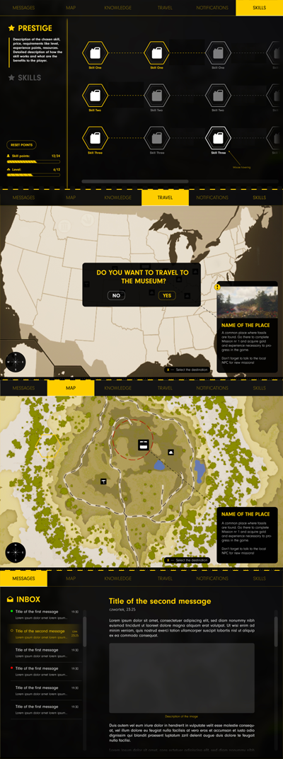 Here are shots of some WIP menus, namely – Skill tree, Travel, Map and Inbox.