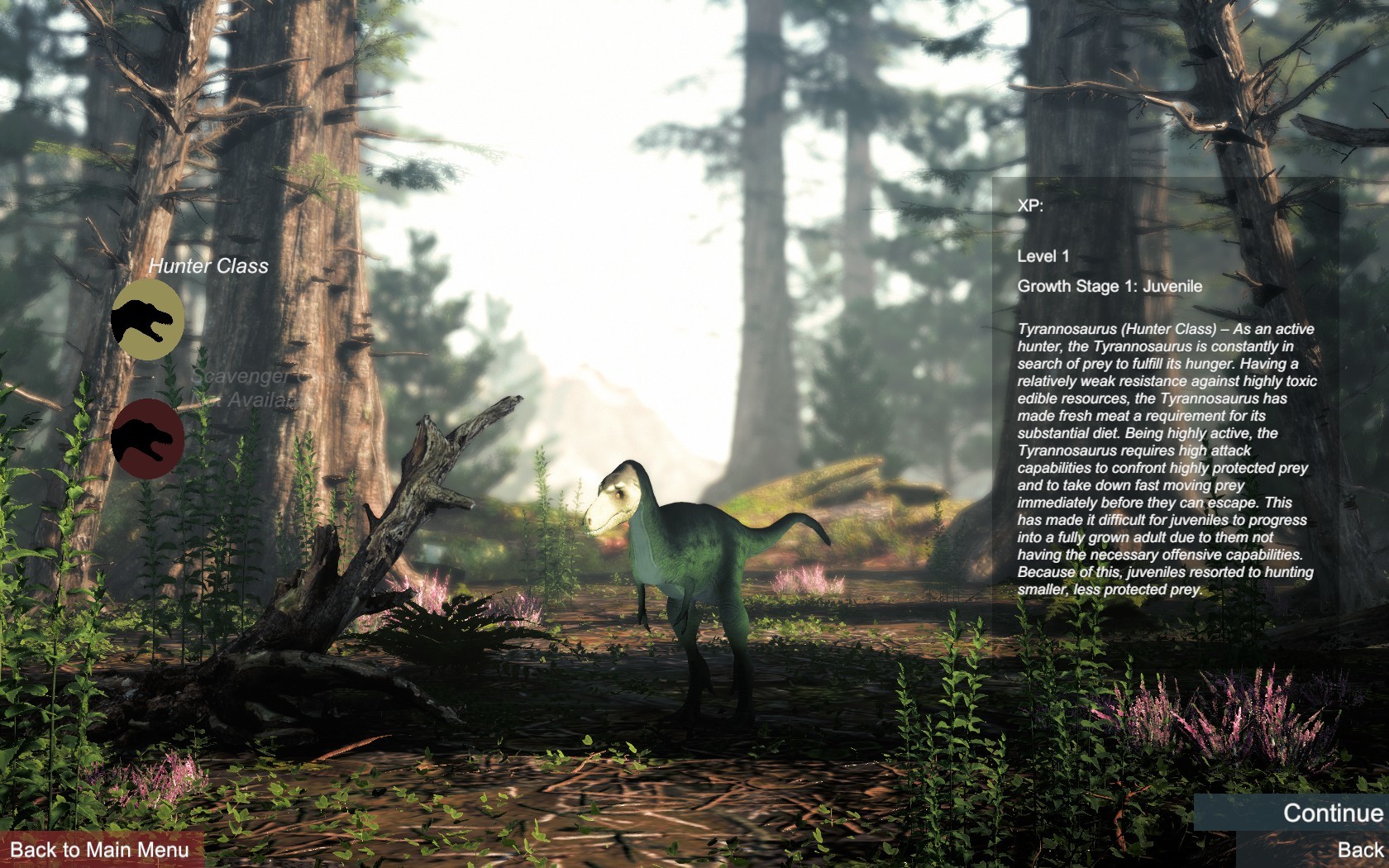 • Saving system: progress for each dinosaur is stored automatically for each individual dinosaur so you don’t have to start a new game if you want to play as a different dinosaur. Because of this you can play as a tyrannosaurus, quit the game or to the main menu, and play as a triceratops without losing any progress for both of them.