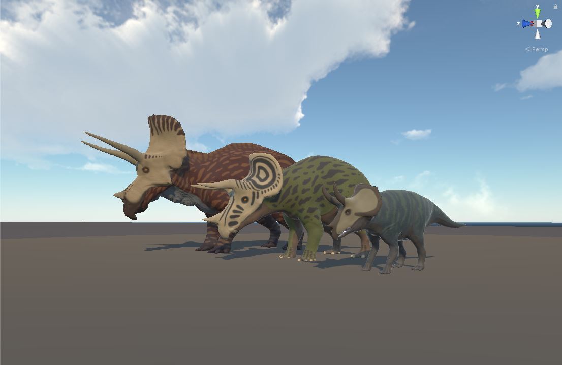 To give a little bit of insight about the triceratops, the models are ready, however, we would still need to animate the juvenile and sub-adult. Aside from animation, we are also working on edible plants for our triceratops to eat and further integrating them with our population dynamics so that they will change when the creature grows. We will definitely give you more info once the animation has been finalized.