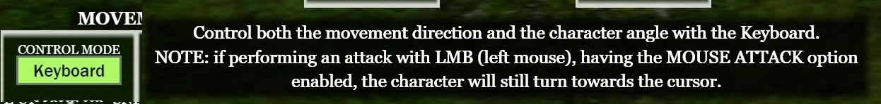- "Absolute" renamed to "Keyboard", which controls the character moving direction with the keyboard input (as before), but now it applies ALSO to the character angle. KEYBOARD is now the default option when the game is first started.