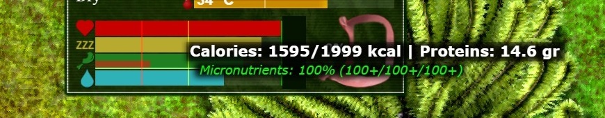 - The character now needs 3 Micronutrients, represented in a global % value.