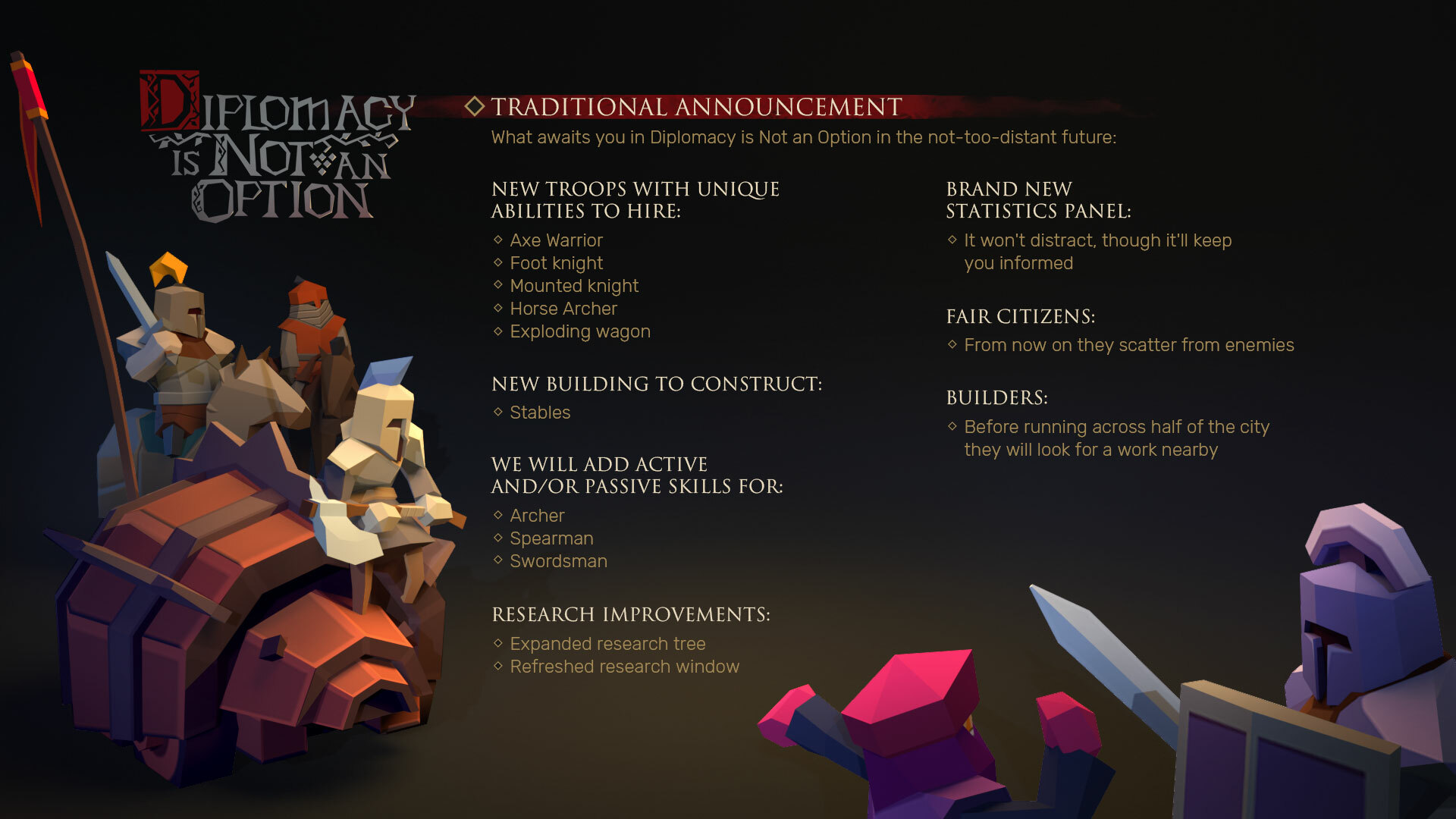 From the very first days of the development we claimed that Diplomacy is Not an Option has a lot of winning tactics. We also said that weaker troops can be useful in the late game. Experience has shown that Swordsmen and Archers can hardly compete with more expensive units. With the new infantrymen (and Horse archers) jumped in, it will become even harder for Tier 1 troops to be helpful. As a compensation we've given them active skills: