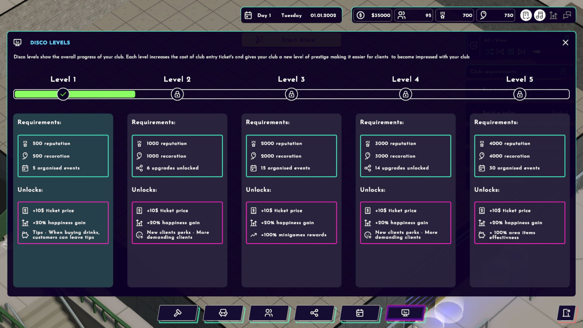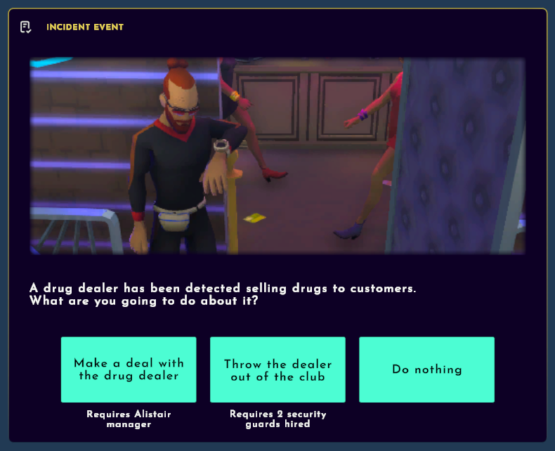 Thanks to your suggestions we’ve realized some issues with the way your guests used to behave and finally we’ve finished introducing changes to their decisions, pathing and actions. From now on they’ll choose their way more efficiently, taking the distance from their destination into consideration. We’re currently procuring tests with large scale clubs with the amount of guests counting in hundreds to make sure everything works as intended! 🙂 Last but not least, we’ve also added the display of the end of the night summary. Please, take a look. 🔎