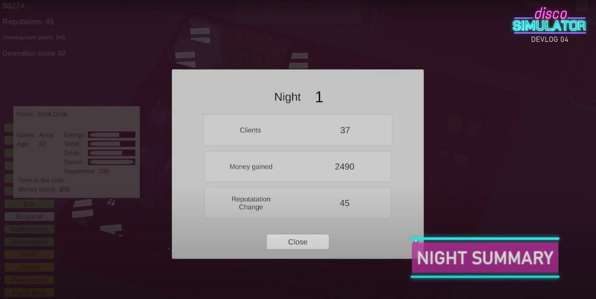 Our next devlog will focus mainly on the AI side of workers and clients as well as the whole human resources tab in the game so be ready for even more under the hood changes and tech-talks. We will also introduce more furniture, lights, special effects, speakers to fill your club and give it the proper life it deserves.