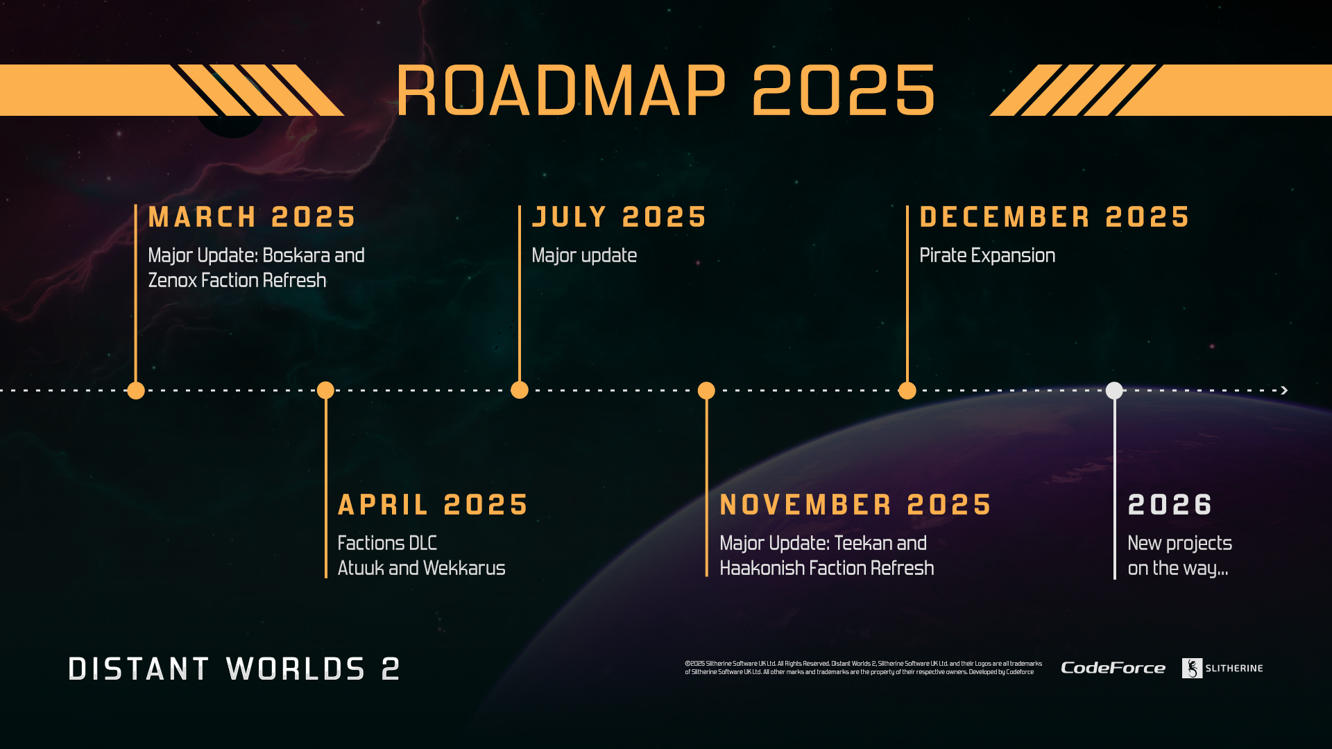 Hello and Happy New Year to everyone in the Distant Worlds 2 community. As before, Elliot and I would like to thank our players for their patience and support since Distant Worlds 2 was released. 2023 saw our first two expansions for Distant Worlds 2 along with four Major updates (Aurora, Hyperspeed, Discovery and Fleet). We continued improving DW2 with the Stellar, Game Faction and Maintenance updates in 2024, along with the release of our first feature expansion, Return of the Shakturi. Thus in 2024 customers received faction refreshes and many, many game improvements and fixes for free along with the one big Shakturi expansion. We hope you have been enjoying Return of the Shakturi and we’re excited to share with you what’s coming next for Distant Worlds 2.
