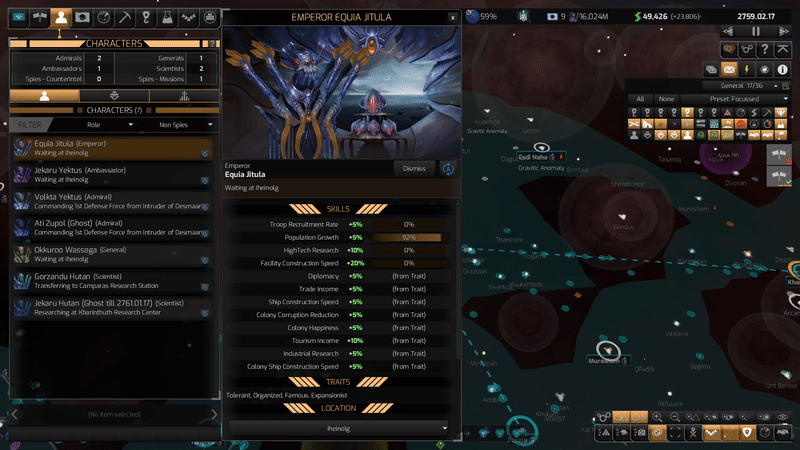 CHARACTERS - made negative character traits from passive activity much less likely for Generals and Admirals (Drunk, Poor Recruiter) - when Spies complete a mission to Steal Tech from another faction, they now remember the details of the last mission, allowing easy one-click reassignment to the same or similar mission (same target faction, same mission type, same research project if not already researched) - reduced amount of characters as empire grows larger, but with slightly higher amount at start of game - added new sort options to Spies screen: sort by each spy skill type (Counter Espionage, Espionage, Sabotage, etc) - fixed Prisoners list filters showing characters for wrong role - automated Spies will now avoid selecting research projects to steal that are disallowed for their empire's race