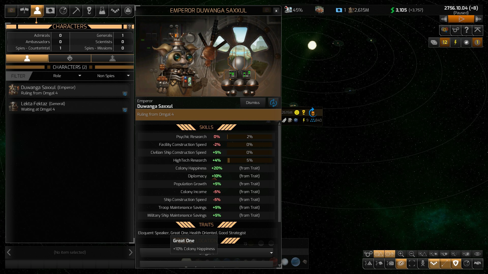Unique mechanics tied to the Atuuk Great Direction – a cyclical change of focus for Atuuk society that greatly improves their abilities in a singular area of their empire, ranging from improved research to greatly enhanced combat strength, and many more, while also providing an increasing number of victory objectives to prove their greatness to the galaxy. Periodically, Atuuk will need to choose a new Great One from a pool of their own marked with Great Potential to lead them on their Great Direction. Some Atuuk may have reservations on the direction the Atuuk are taking with Direction Doubt, though this is only temporary.